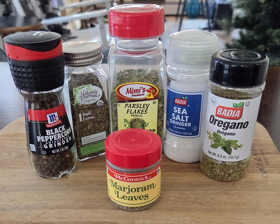With the spices, you can always omit one if you don’t have it – basil, for example – without affecting the recipe too much.